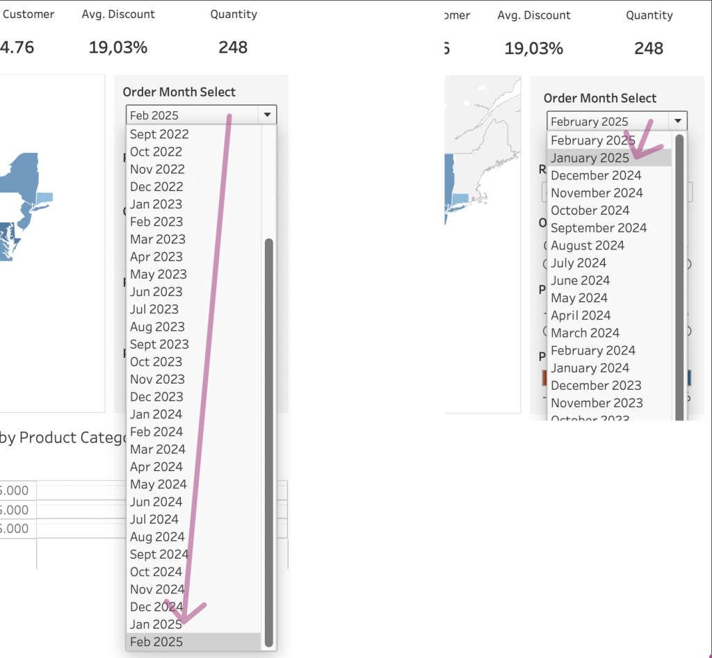 If you create a drop-down filter or parameter for dates, the selected date (this month) is usually on the bottom of the list. This has the implication that if you want to select previous month, you have to select the value which is pretty ‘far away’ from the filter.