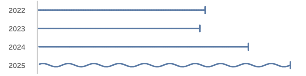 Recently I ran into a small but surprisingly tricky problem: how do you visualize something that’s in progress? A standard bar chart works usually perfectly for completed values, but what about the final bar isn’t finished yet because e.g. the year isn’t finished yet,
