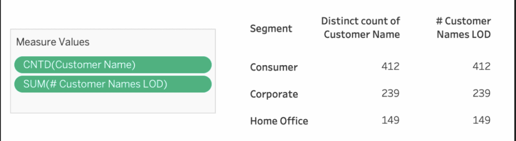 Since the aggregation (the FIXED part) is executed early in Tableau’s order of operations, and the final aggregation is a simple SUM, this method often performs much faster than a standard COUNTD.